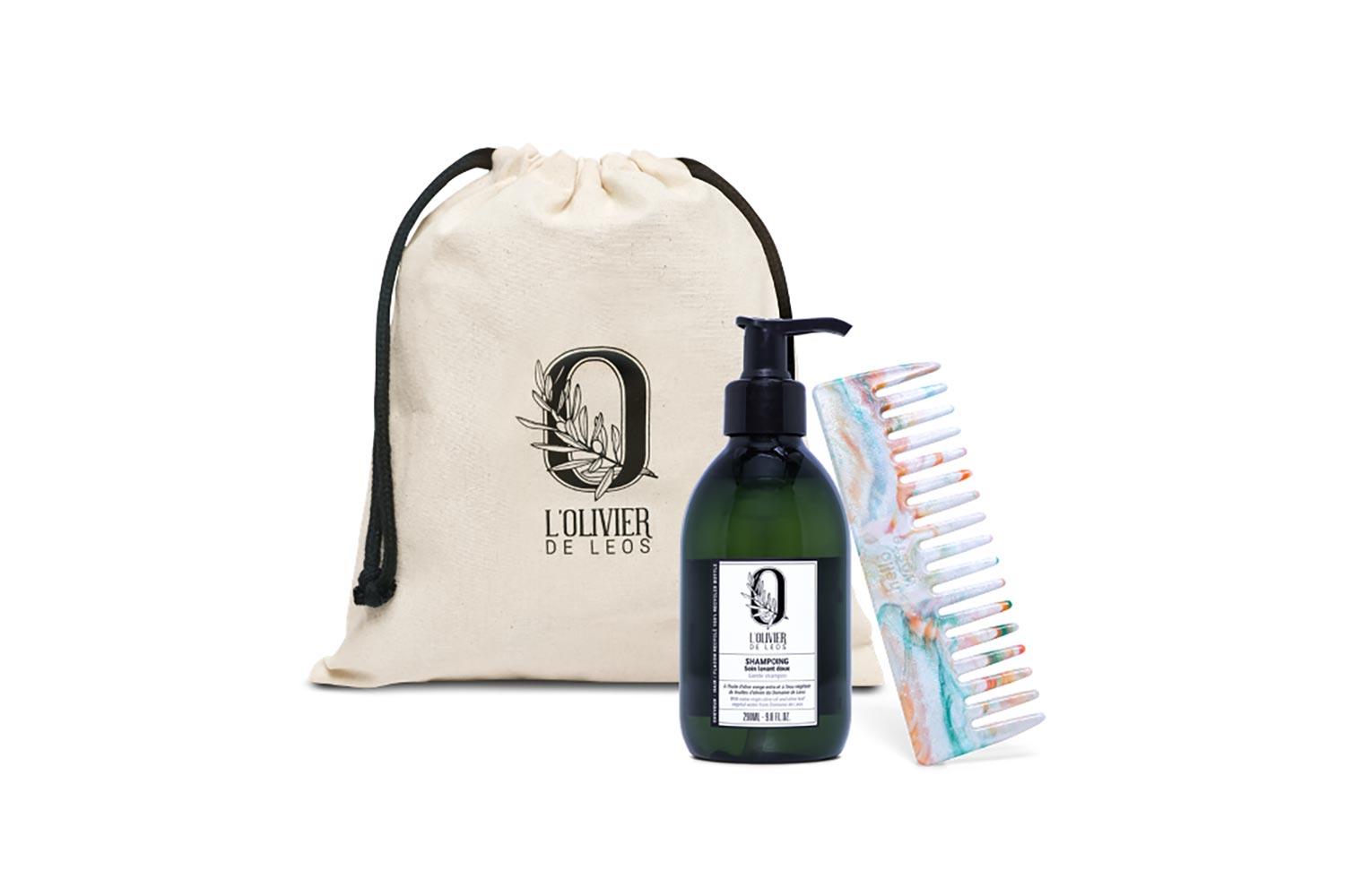 Découvrez une routine capillaire bienfaisante qui allie soin des cheveux et respect de l’environnement, grâce à un shampoing doux naturel enrichi d’extraits d’olivier pour un lavage procurant brillance et souplesse, associé à un joli peigne démêlant entièrement upcyclé, et présenté dans un pochon en coton bio. Tous types de cheveux, particulièrement apprécié des cheveux normaux à secs.